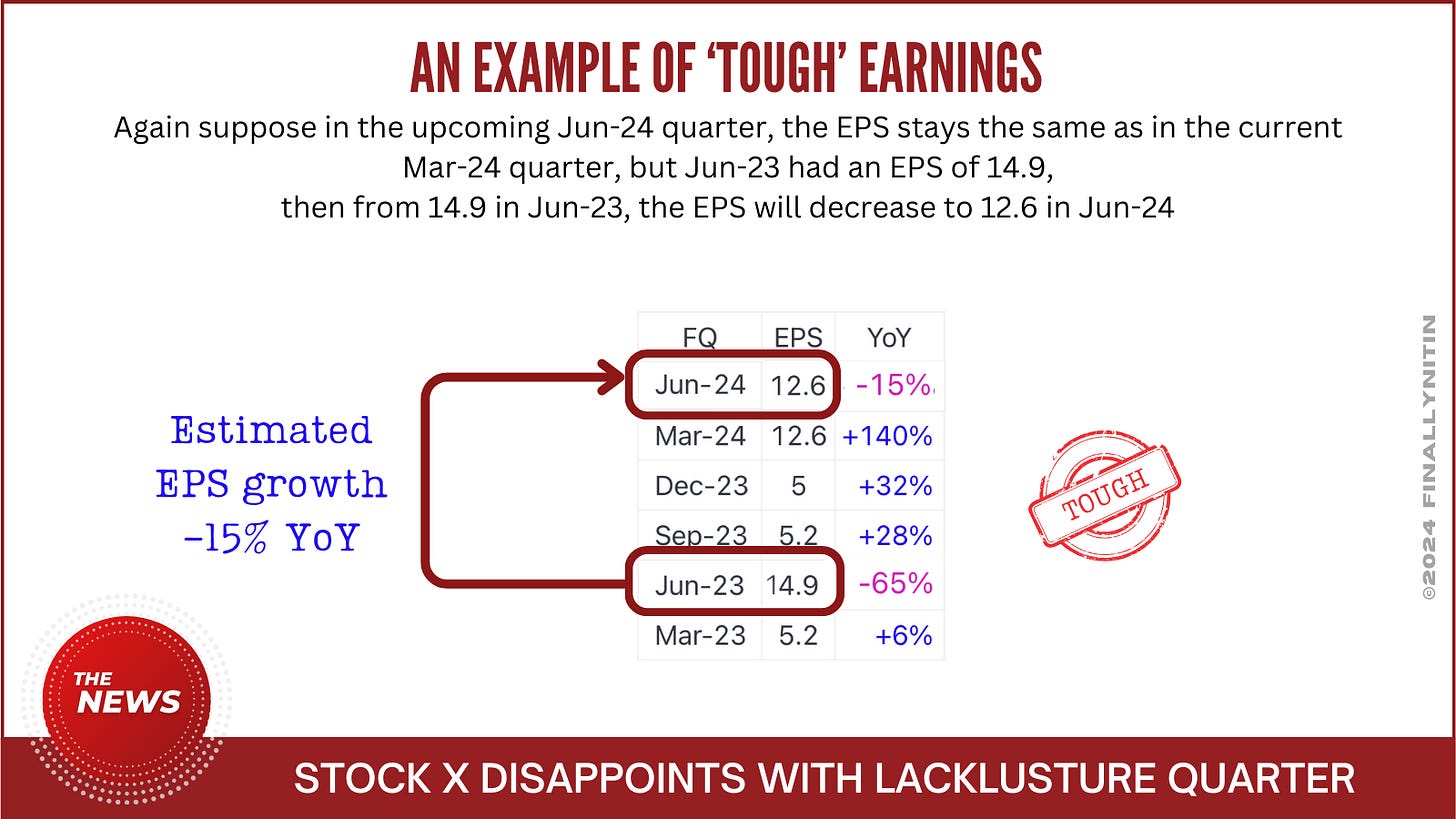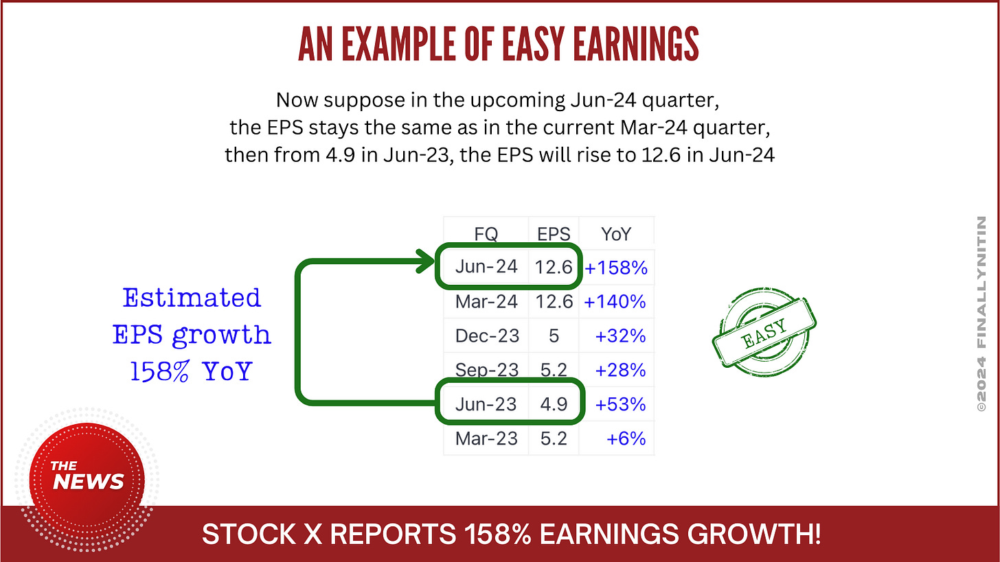Look at the EPS of same quarter last year: Check what was the EPS in the same quarter last year. If the upcoming quarter is June 2024 (for example), then we need to look at the EPS of June 2023.