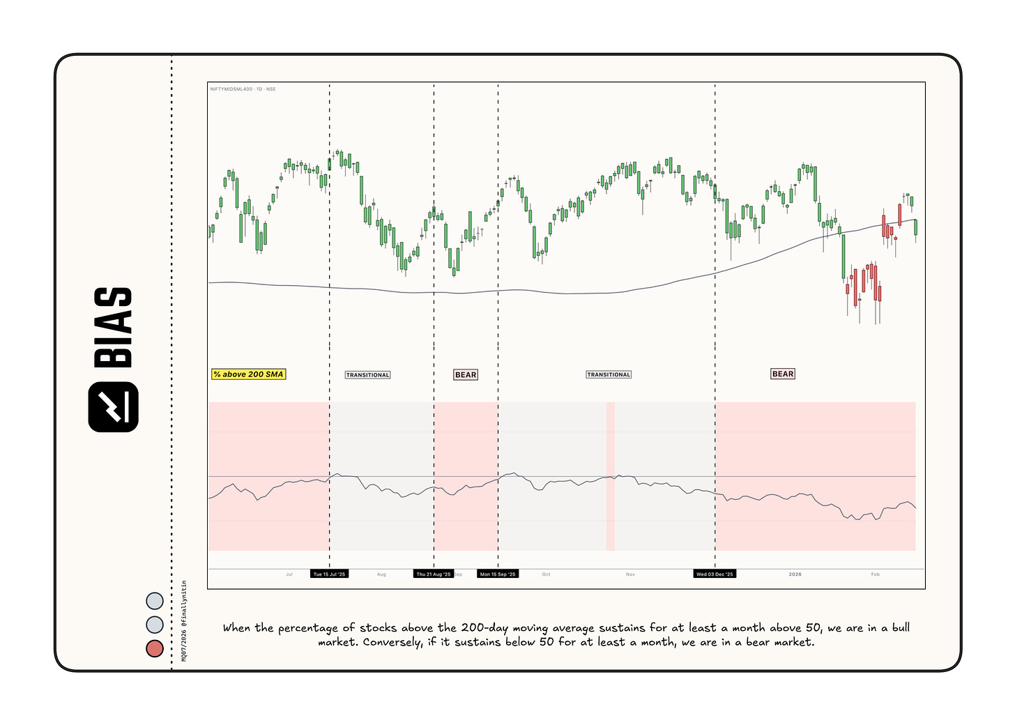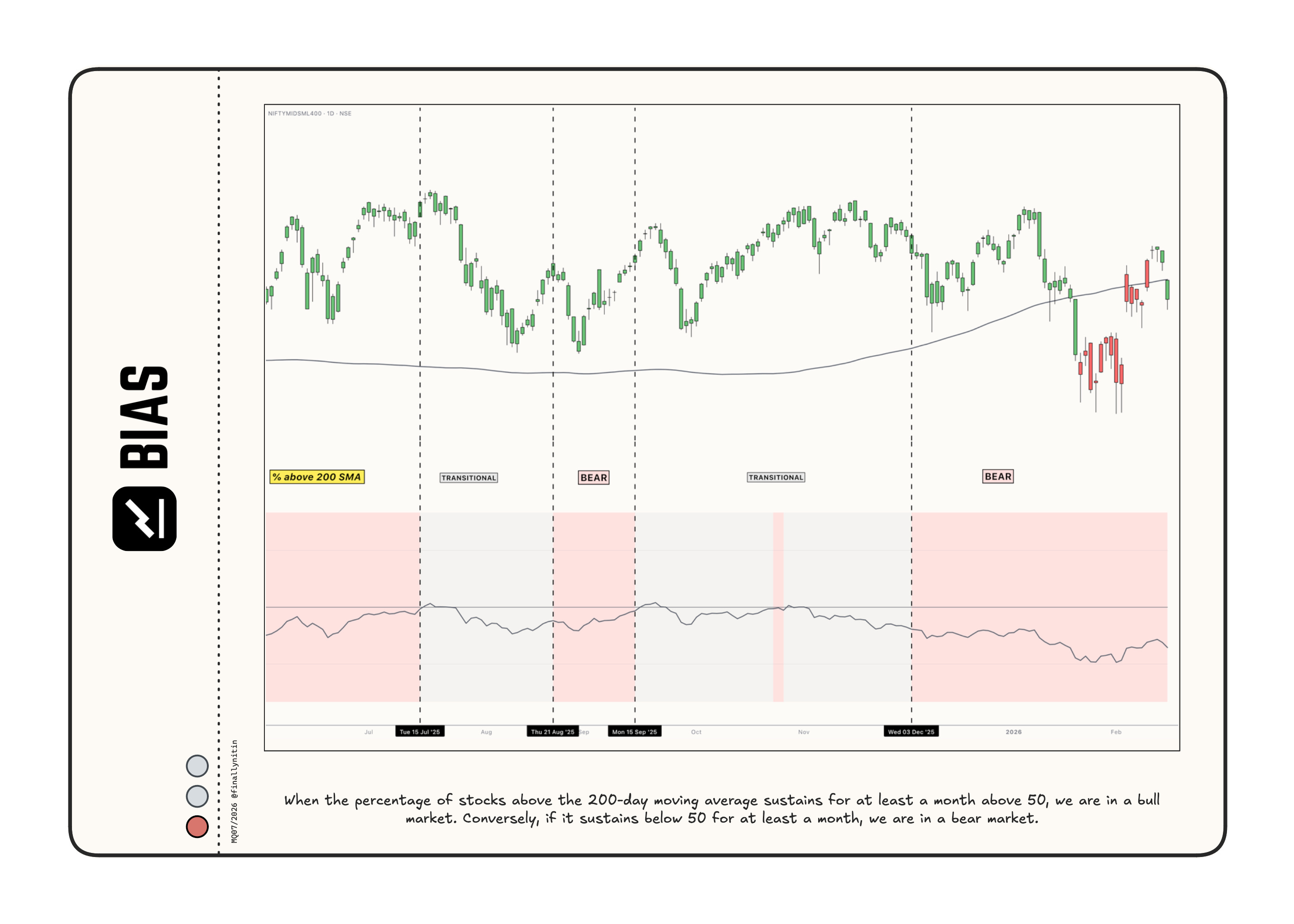 Over the past month, more than 50% of stocks have remained below their 200-day simple moving average (SMA). Hence, we stay in a bear market.