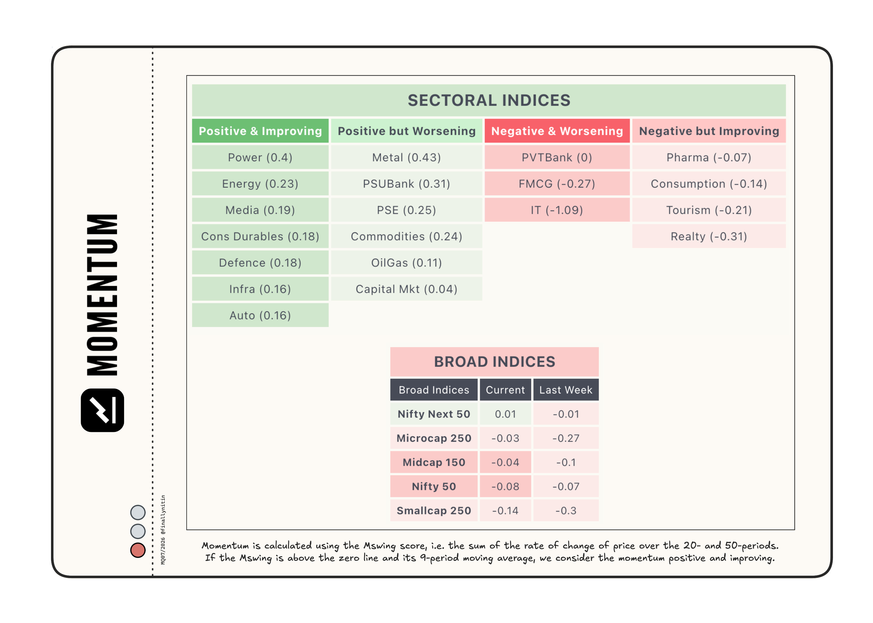 Power, energy, media, defence, infra & auto are the relatively stronger sectors at the moment, as they have positive & improving momentum. The momentum is still positive but worsening in Metals, PSUBanks & Oil/Gas.