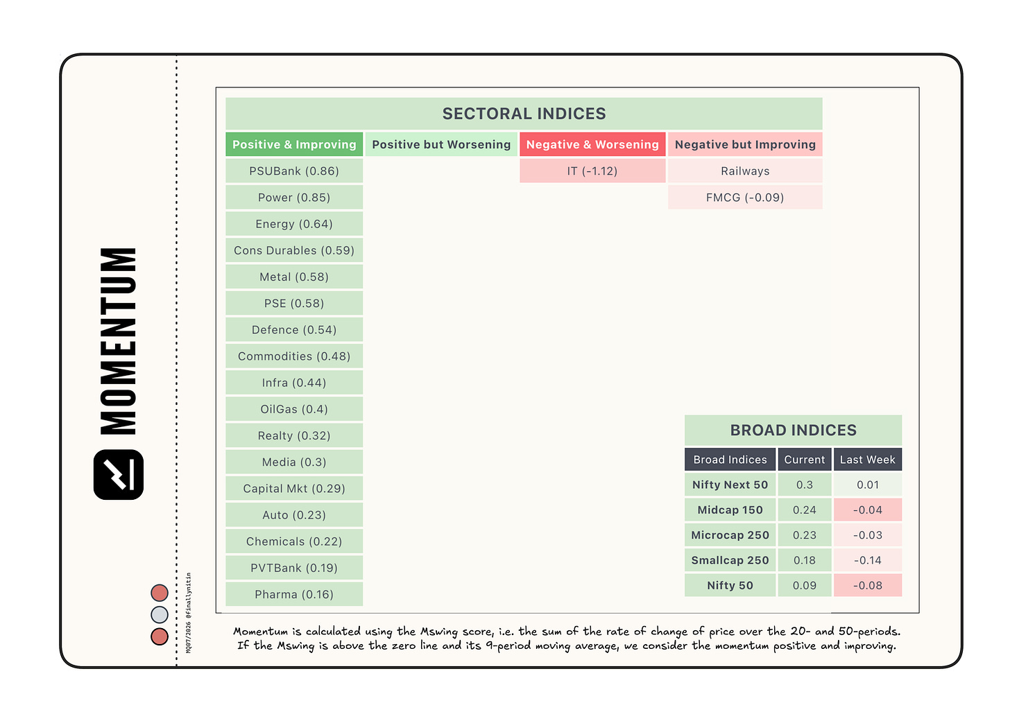 PSUBanks, power, energy, consumer durables, metals & PSE are the relatively stronger sectors at the moment, as they have positive & improving momentum.