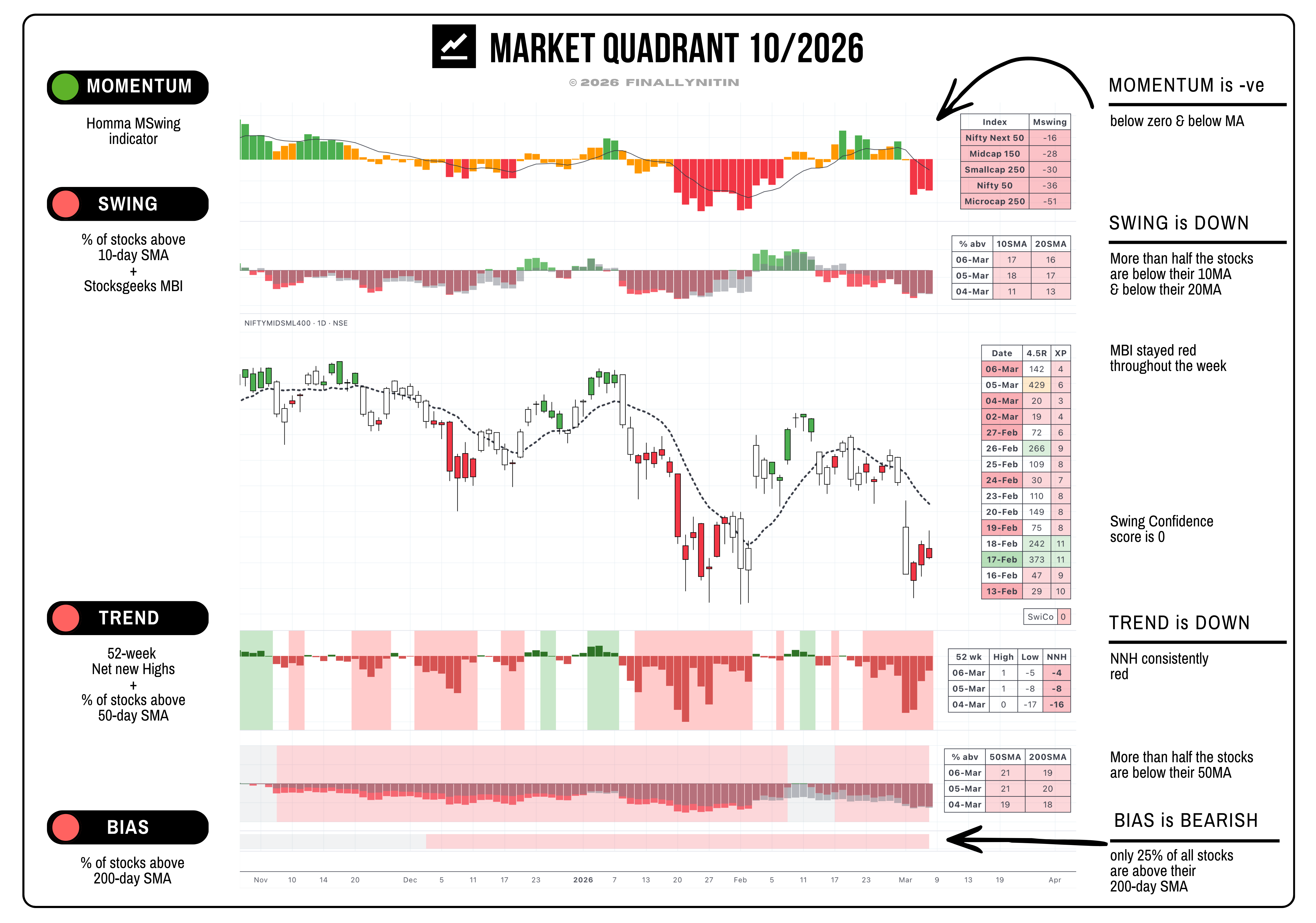 The MBI remained red throughout the truncated week, with subdued 4.5R readings, indicating limited broader participation. There was one single day (Thursday) of a technical bounce, but that was insufficient to alter the bearishness in any meaningful way.