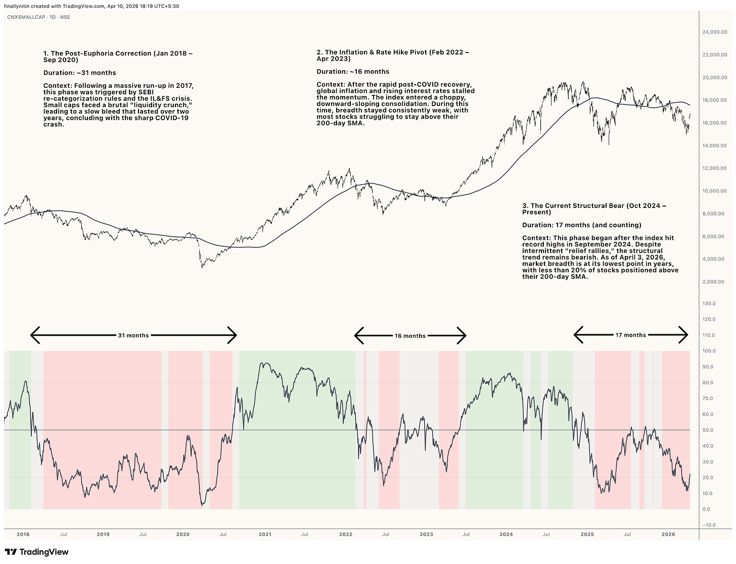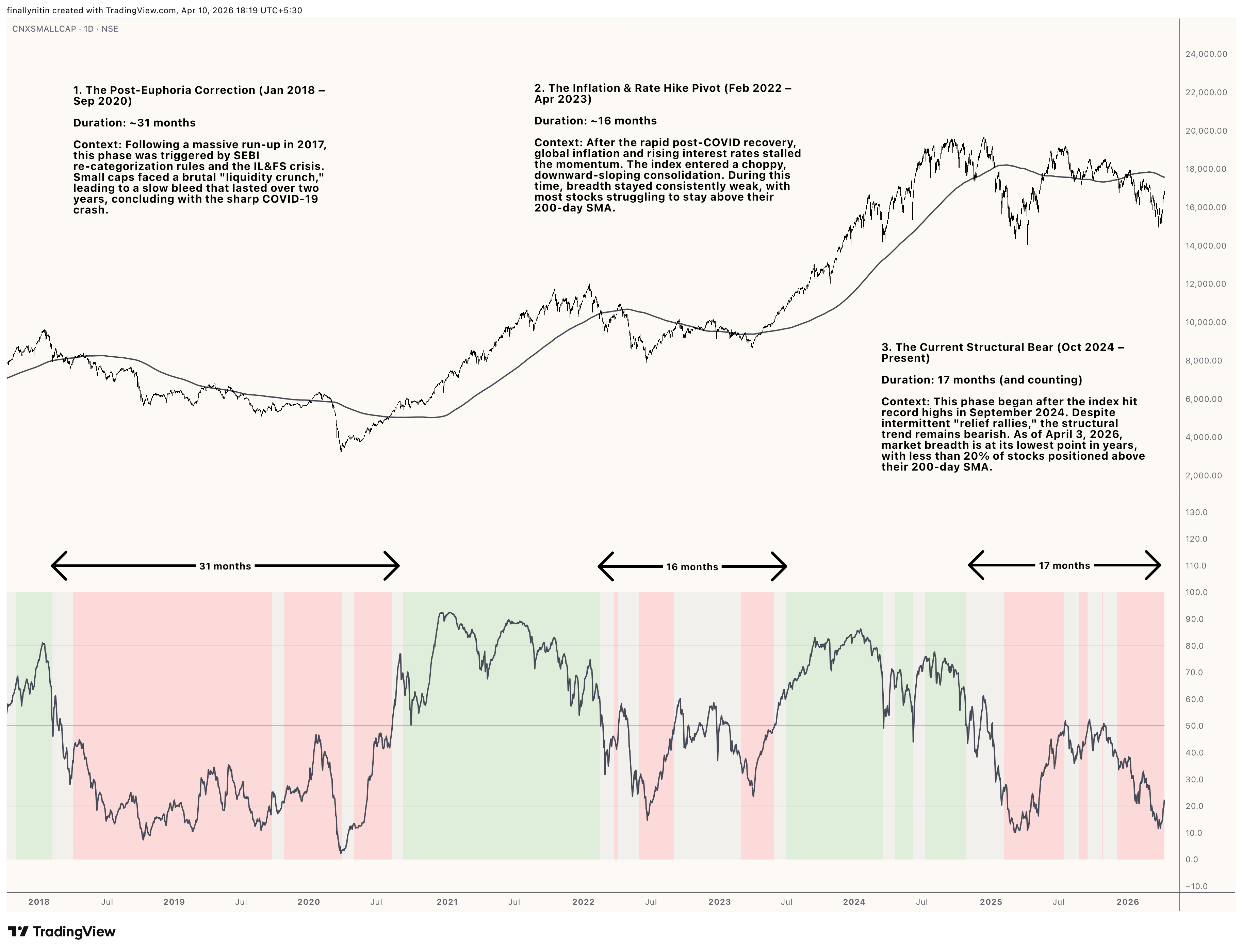 Indian markets have experienced three distinct bear phases since 2017: the Post-Euphoria Correction (31 months, 2018–2020), the Inflation & Rate Hike Pivot (16 months, 2022–2023), and the current Structural Bear (17+ months, Oct 2024–present). The current phase has already surpassed the 2022-23 correction, with less than 25% of stocks above their 200-day moving average.