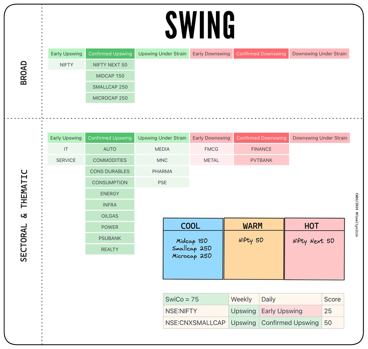 ⦿ Nifty is in an early upswing, while Smallcap 100 is in a confirmed upswing, Swing Confidence is 75, which means that the portfolio should take less than the maximum permissible open risk.