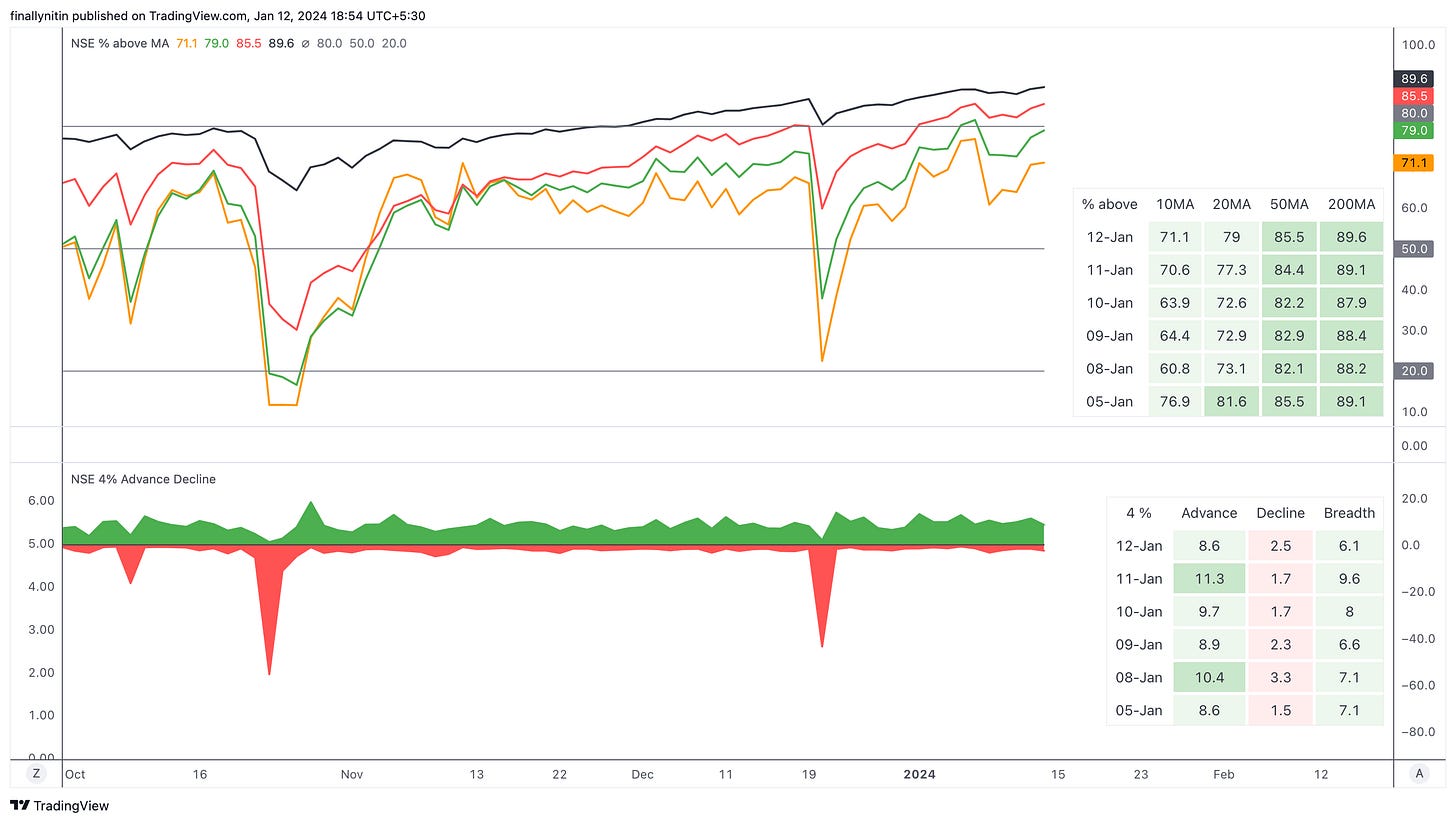 ⦿ Net breadth as per 4% advance & decline is positive, with intermittent double-digit advances.