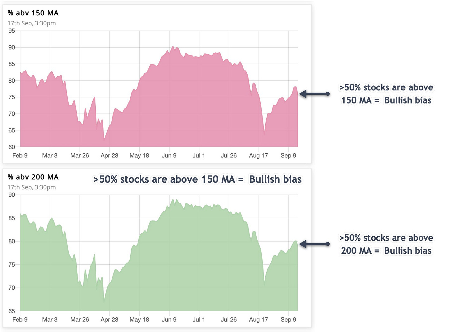 Similarly, short-term bullish & bearish biases are when the market breadth of 20-day & 50-day MA is above or below the 50% threshold, respectively.