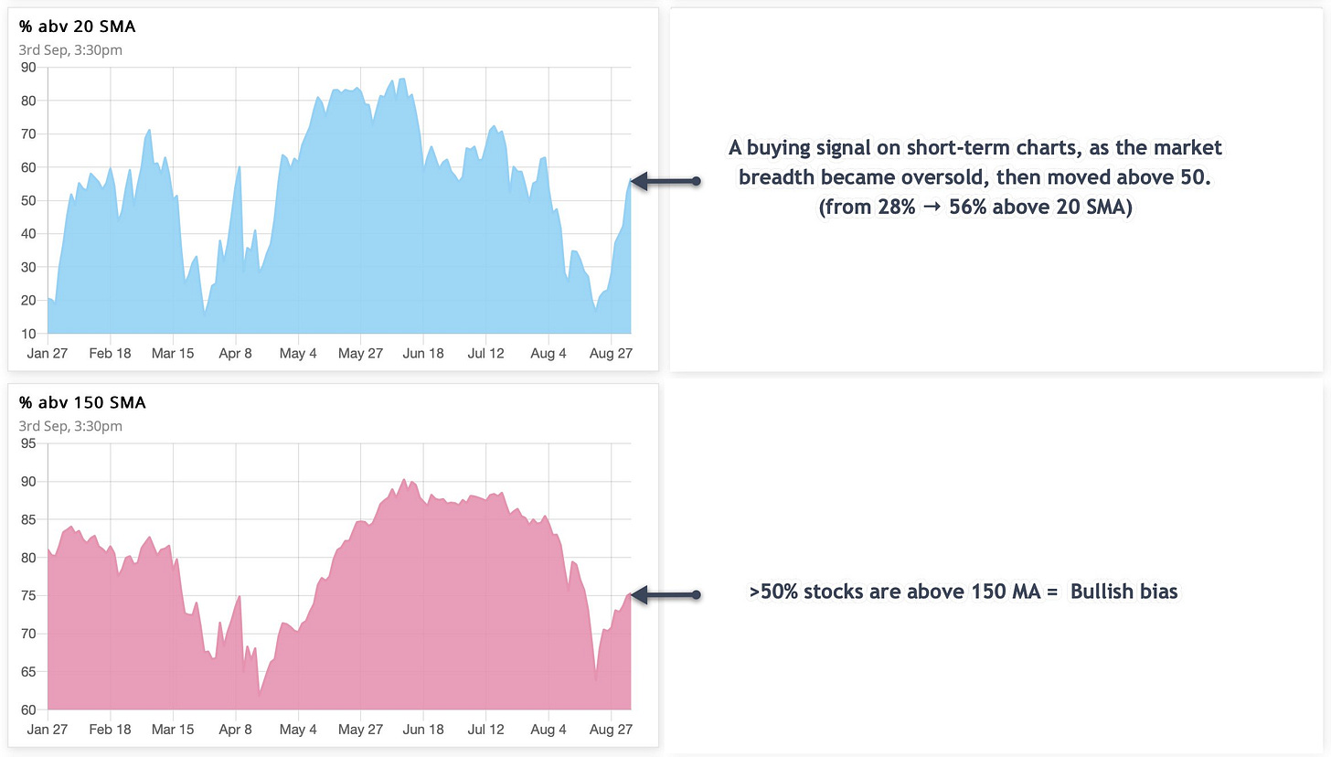 With >50% stocks already above 150 & 200 MA, we get a signal for initiating fresh longs on short-term timeframes if the 50MA market breadth first goes oversold & then crosses above 50%.