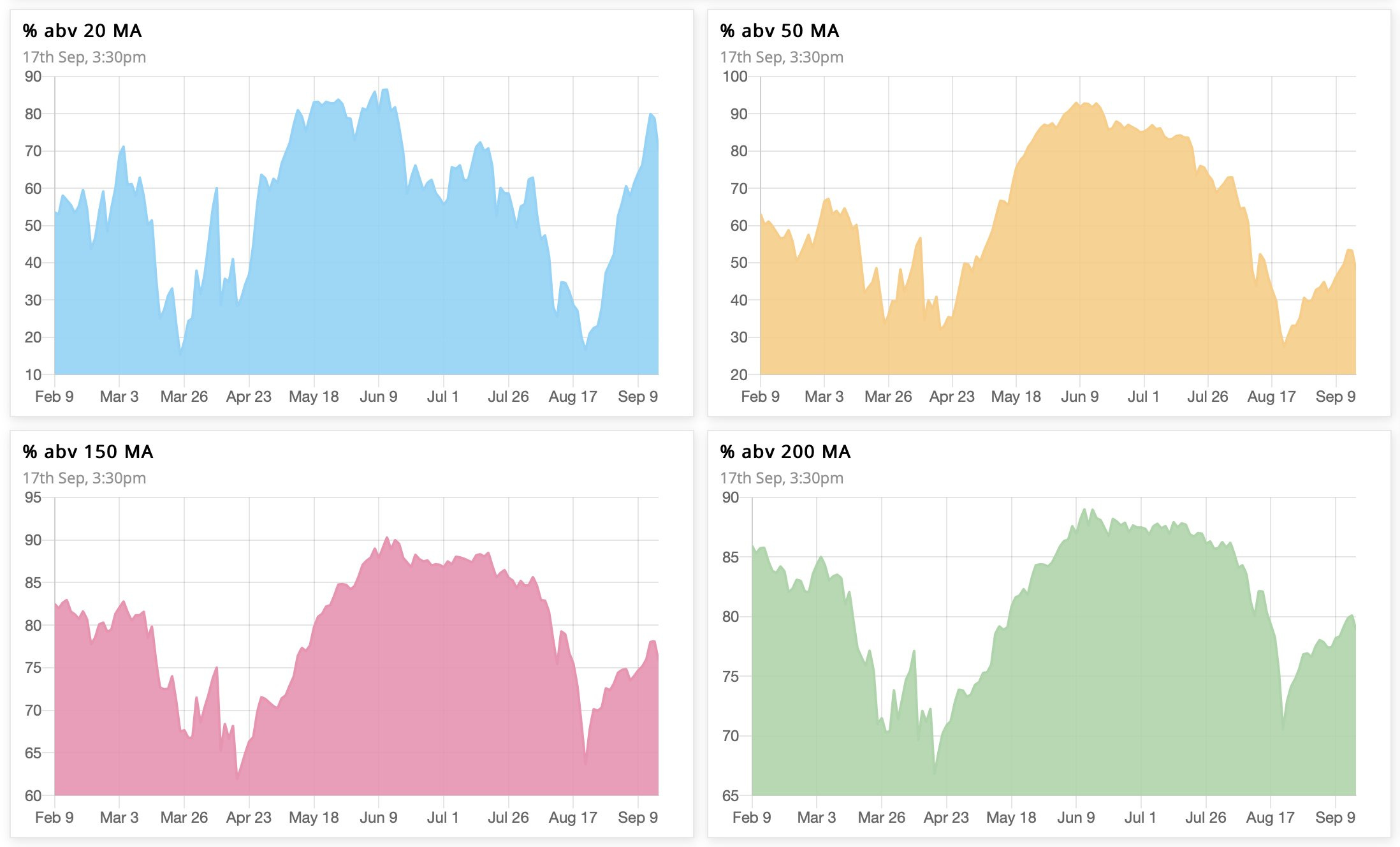 Among many ways to measure this, one simple way is the % of stocks trading above a certain moving average. When most of the stocks are trading above a specific moving average, the market breadth is termed strong.