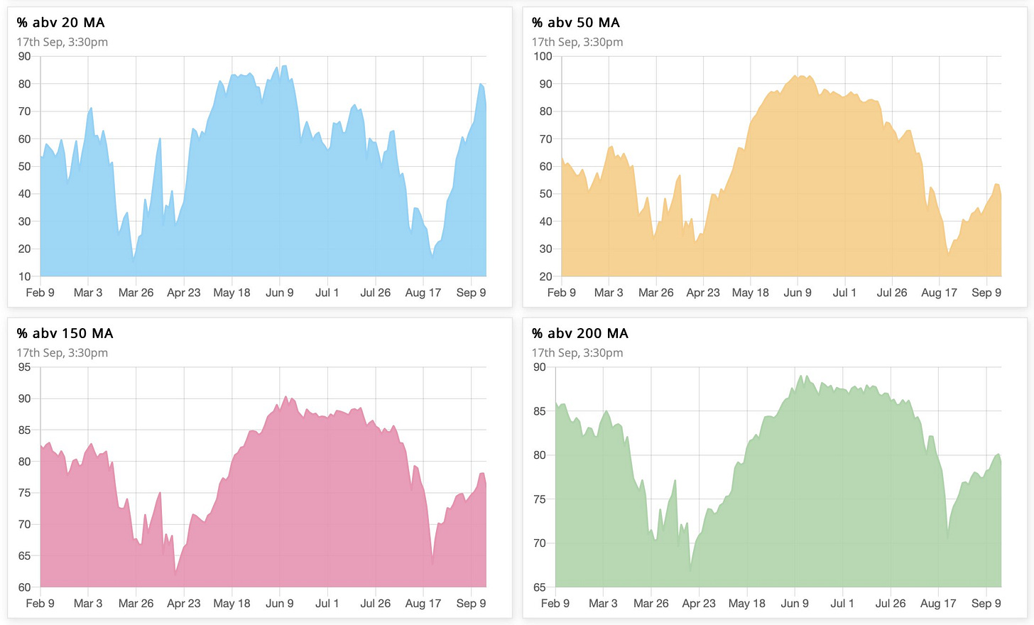 We have a bullish bias when >50% of stocks are above their 150-day and 200-day MAs. We have a bearish bias when <50% of stocks are above their 150-day and 200-day MAs. We do not see the longer-term timeframes for oversold or overbought levels.