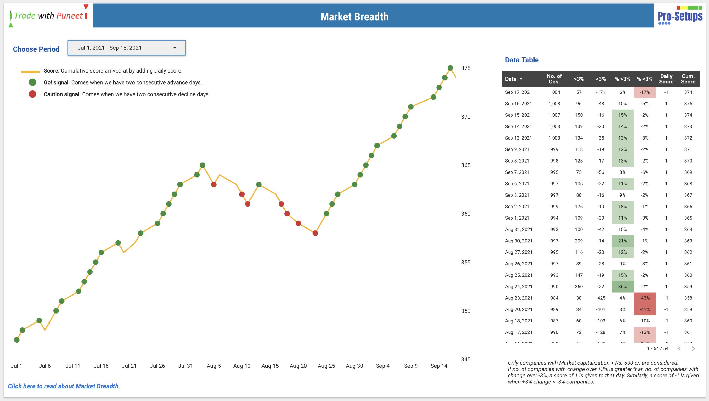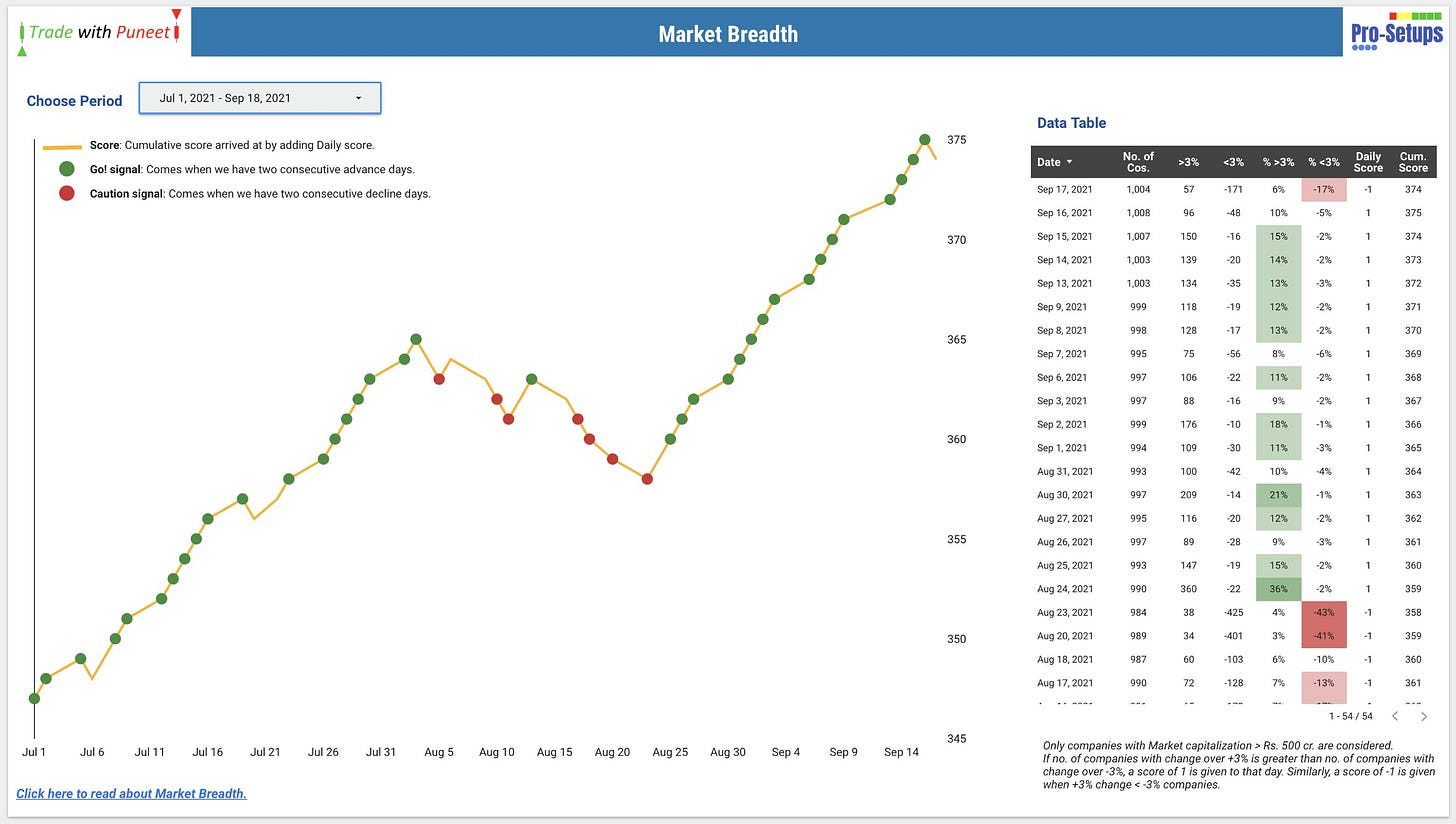 Market breadth measures the degree of participation & the conviction in the overall mood of the underlying index. A positive market breadth is said to happen when more stocks are advancing than are declining.