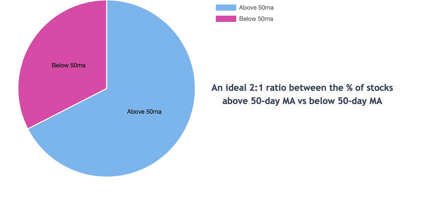 For swing-trading, we would love to see a 2:1 ratio between the % of stocks above 50-day MA vs below 50-day MA. A ratio below 1:1 is not healthy & the probability of getting big moves is less.